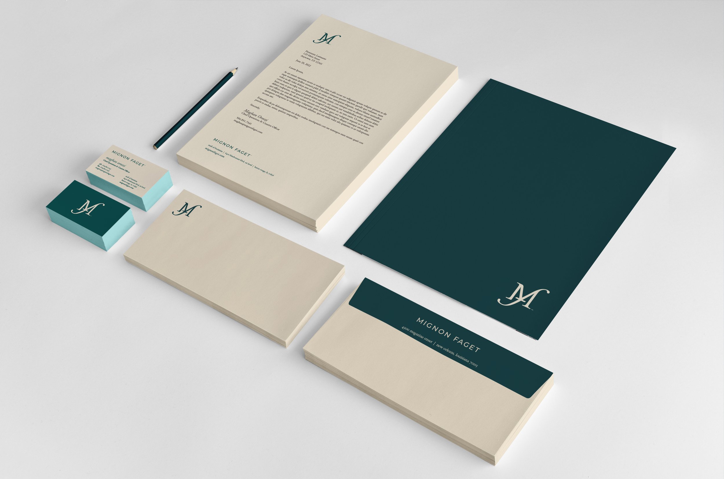 The new Mignon Faget brand identity centers around a striking monogram that combines traditional typographical letterforms into a memorable, modern icon. Like Mignon Faget’s jewelry, the monogram echoes the forms of nature and architecture, with leaf-like tendrils and columnar verticals. It evokes Carnival royalty, lavishness and pageantry, but retains an understated sophistication that earns attention without screaming for it.